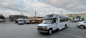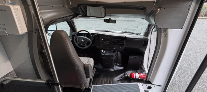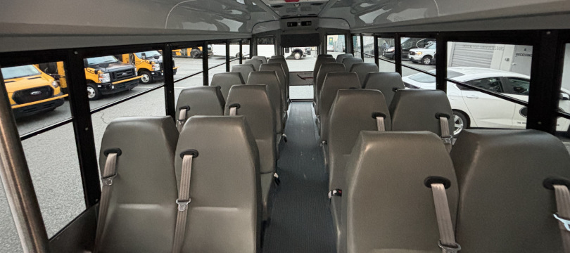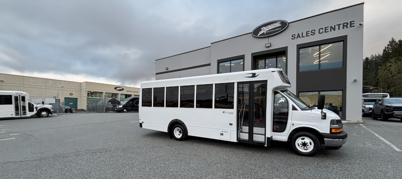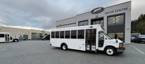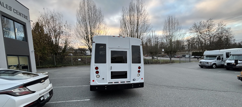 Manufactured in Canada // 2024 Chevrolet Girardin G5, 177” Wheelbase, Dual Rear Wheels // 6.6 Litre V8 Gas Engine; GVWR 14,200 Lbs // Transmission Oil Cooler, Engine Block Heater // Heavy-Duty Alternator, Dual Batteries // Fuel Tank 57 Gallons (215 Litres) // Oxford White Non-Corrosive Exterior Aluminum Body Panels // Rear Emergency Door // 32" Electrically-Operated Entry Door with Entry Grab Rail & External Keyed Entry // AM/FM Stereo System with 4 Speakers // HSM High Back Passenger Seats w/3-Point Seatbelts, Seat Fabric Level 1 Ash Grey Vinyl // 40,000 BTU Rear Air Conditioner // 1x 42,000 BTU + 1x 20,500 BTU Under Seat Heaters // Front Cap Window // USB Chargers // Backup Camera w/Screen in Mirror // Heated/Remote Sideview Mirrors // Smooth Grey Rubber Flooring w/Ribbed Aisle //