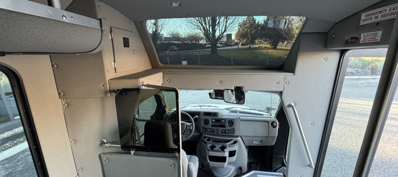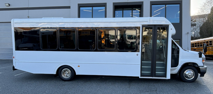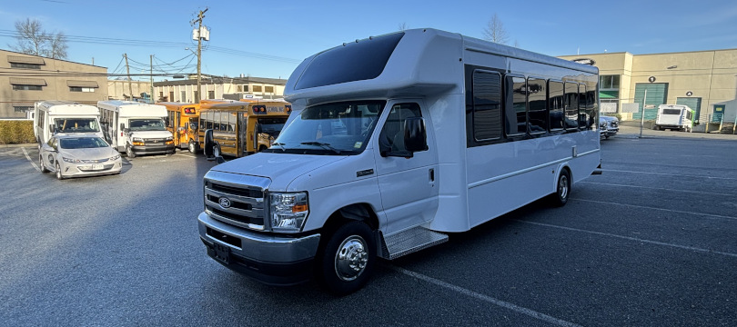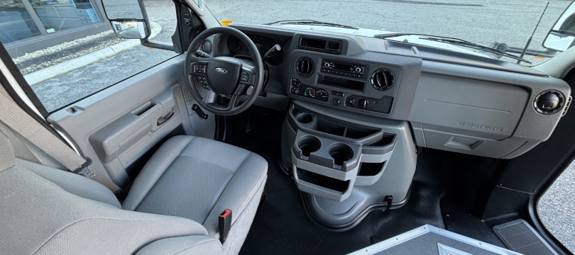 2026 Ford Turtle Top Terra Transit, 206" Wheelbase // Ford E-450 Super Duty with 7.3 Litre V-8 Gas Engine // Heavy-Duty Alternator, Dual Batteries // Bright White Non-Corrosive Exterior Aluminum Body Panels // 28" Rear Luggage Compartment with Rear Door // 36" Electrically-Operated Entry Door with Entry Grab Rail // AM/FM Stereo System with 4 Speakers // Power/Heated Side View Exterior Mirrors // Grey Altro Non-Slip Safety Flooring // Freedman Go-ES 3-Point Passenger Seats // Seat Fabric Upgrade to Level 4 Seat Fabric Leatherette - Raven Black // Flip-Up Armrests // 70,000 BTU Rear Air Conditioner // (x2) 70,000 BTU 3-Speed Under Seat Heaters // USB Outlets at Every Seat //